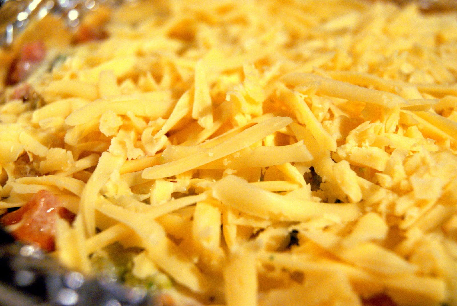 Składniki z patelni wykładamy na podpieczony spód, wylewamy jajeczną masę i posypujemy na wierzch resztę sera.