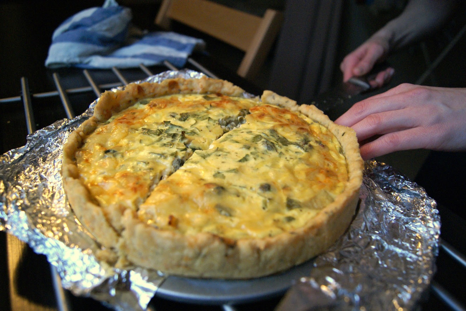 Ciasto wyciągamy z piekarnika, ostrożnie nakładamy zawartość patelni, artystycznie wrzucamy kapary ;) Wylewamy masę jajeczną i wkładamy z powrotem do piekarnika na kolejne 20 minut, do momentu aż masa się zetnie. Gdy po upływie czasu, masa nadal będzie rzadka, spokojnie – kolejne 10 minut nie zaszkodzi ;)
