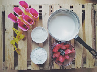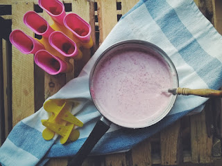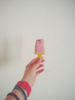 Śmietankę łączymy z cukrem pudrem i przez chwilę gotujemy na palniku. Odstawiamy na moment, do ostygnięcia :) Truskawki miksujemy. Do naszej papki dodajemy jogurt grecki i dokładnie mieszamy. Dorzucamy zmiksowane truskawki i gdy wszystko nam się ładnie połączy, przelewamy do foremek. Uprzednio, na dnie każdej, wrzucamy pokrojone owoce i dopiero wtedy zalewamy! Zaklejamy patyczkami i do lodówki na… nie wiem, 5 godzin minimum! Później nie pozostaje nam nic innego jak jeść lody dla ochłody :)